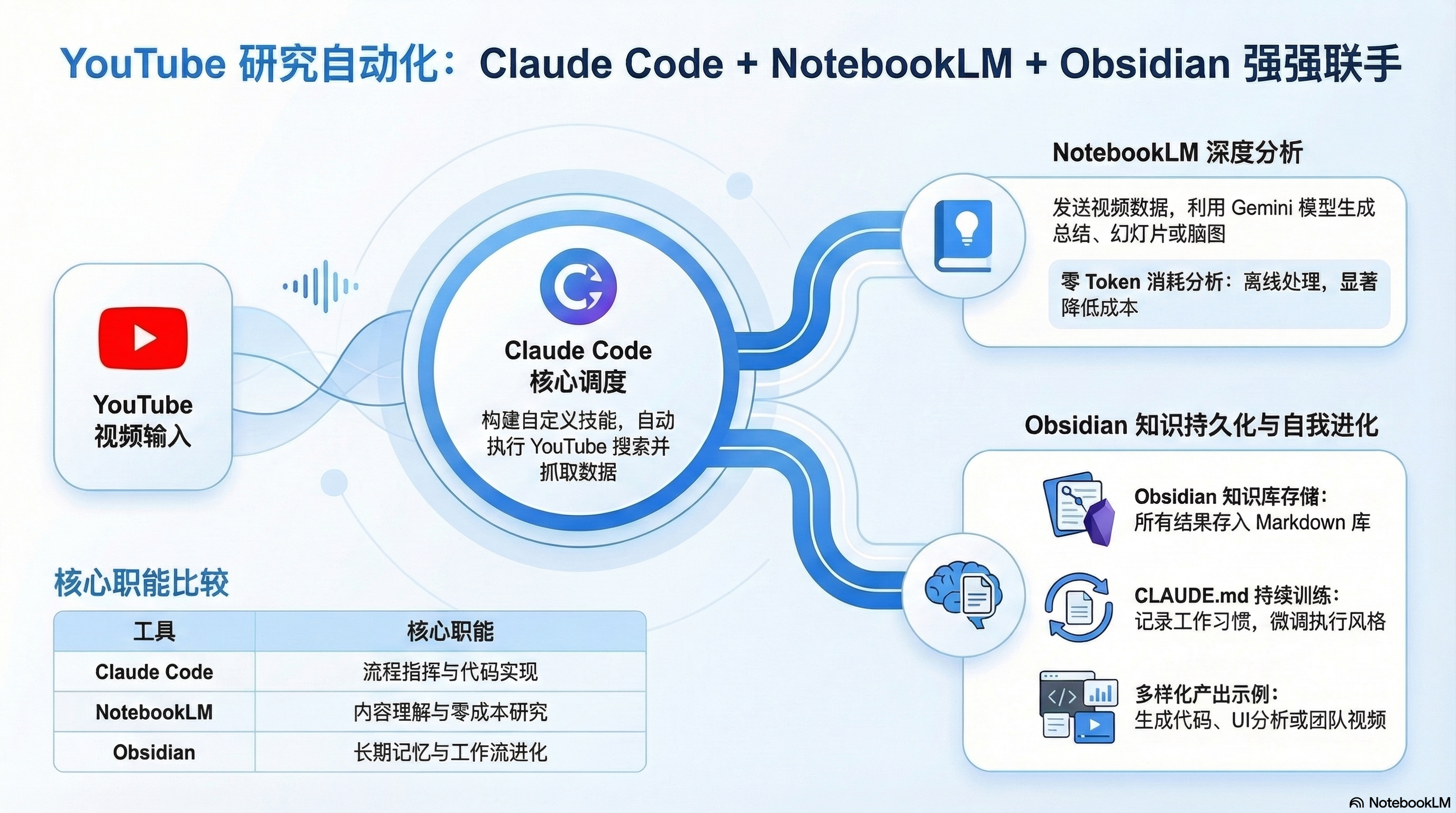 一个话题输入,全自动研究输出。本文介绍如何用 Claude Code Skills + NotebookLM 构建端到端的 YouTube 视频研究工作流,实现从搜索、筛选、分析到生成报告的全自动化。